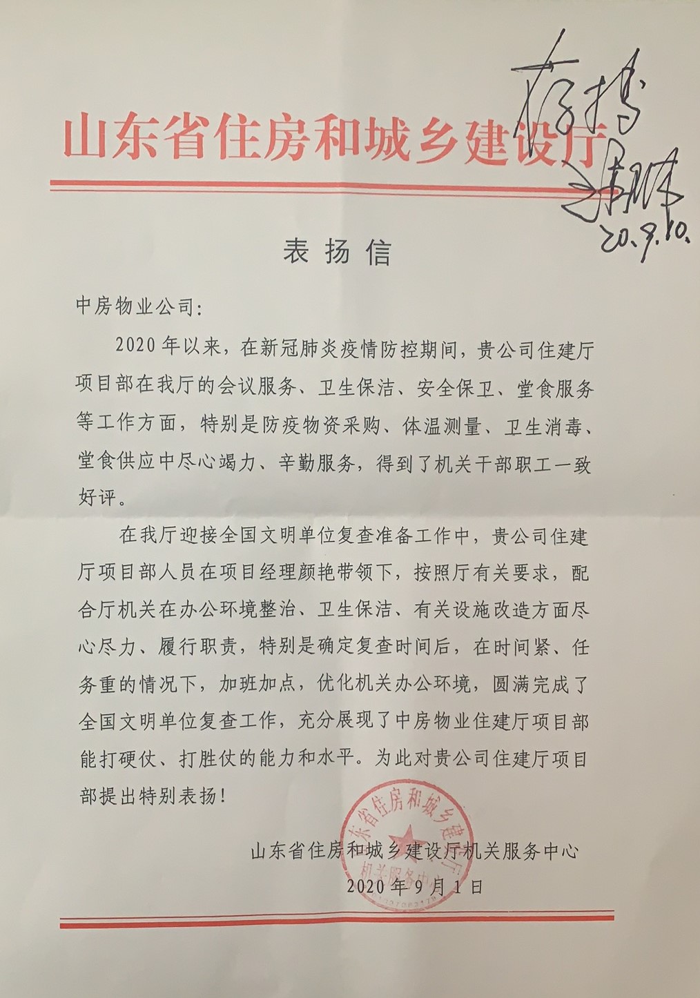 省住建廳物業(yè)處得到委托方領(lǐng)導表揚