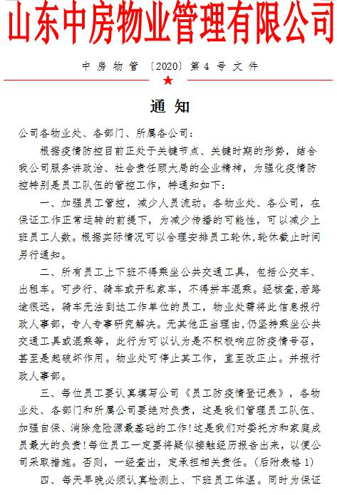 疫情就是命令,中房物業(yè)在戰(zhàn)斗防控新型冠狀病毒肺炎阻擊戰(zhàn)工作簡報2020年3月9日 第6期主辦:標準化監(jiān)管部一、總公司動態(tài)1.公司下發(fā)《中房物管〔2020〕第6號文件》,頒布《山東中房物業(yè)管理有限公司疫情防控規(guī)范標準》...